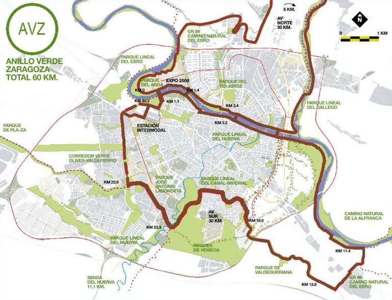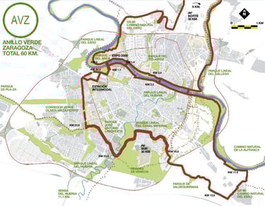 El Anillo Verde de Zaragoza (AVZ) es un corredor natural y recreativo que rodea la ciudad. Está diseñado para conectar los principales espacios verdes, parques y riberas. Nació con la finalidad de regenerar zonas naturales potenciando el entorno del río Ebro y del canal. Tiene una longitud aproximada de 60 Km (aunque el núcleo principal circular tiene 30 Km) permite recorrer a pie o en bicicleta sin apenas encontrar tráfico. Está enlazado con rutas de largo recorrido como son el camino de Santiago o el GR-99 que es el camino natural del Ebro. Es ideal para caminar, correr e ir en bicicleta ya que permite una movilidad sostenible entre los barrios periféricos y el centro.