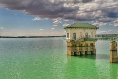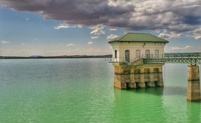 Conforme me voy acercando las vistas mejoran, desde una bajada se divisa el pantano con un color azul oscuro y a la izquierda se empiezan a ver los primeros picos de los pirineos. Detrás del pantano se ve un parque eólico con numerosos molinos y a mi derecha se divisa un campo labrado y una ermita. Al llegar al pantano accedo a él por un camino poco frecuentado de tierra y solo tengo que recorrer 200 m para situarme a la orilla del agua.