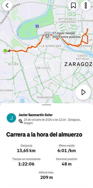Comenzamos en Miralbueno y desde allí hago 1,5 Km hasta llegar a la estación Delicias por la Avenida de Navarra. Desde la estación tomo dirección al barrio de la Almozara por la Avenida de la Expo. Luego cruzo a la Avenida de Francia a la altura del supermercado Lidl. Sigo la avenida que me lleva hasta el Pabellón Puente junto al río. Paso el club deportivo militar El Soto y continúo hasta la Pasarela del Voluntariado. Al cruzarla paso al barrio del Actur y sigo corriendo al lado del cauce del río por la Avenida José Atarés en dirección al Pilar.