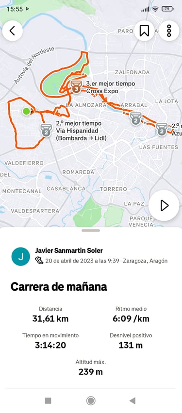 En el lado de Las Fuentes se puede seguir corriendo saliendo de la ciudad por el camino natural GR-99 que sigue el cauce del río pero yo ya decido regresar. Continúo por ese lado de la orilla varios kilómetros hasta volver a pasar el Pilar y cruzar por el Puente de Santiago. Retomo la Avenida José Atarés pero ahora me dirijo por ella a la zona de la Expo. Al volver al Parque del Agua me dirijo a la Torre del Agua y desde allí regreso al Puente del Tercer Milenio. Del Actur paso a La Almozara y de la Almozara a la estación Delicias que bordeo para completar una vuelta por su perímetro exterior. Luego paso a la Avenida de Navarra y de ahí llego a la Vía Hispanidad. En este punto finaliza el segundo tramo que es algo más largo que el anterior.